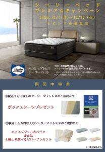 12/1(月)~12/30(火)にて 当店限定『シーリーベッド』プレミアムキャンペーン開催!! 全米シェアNO.1シーリーベッドによるお買い上げ特典は 当店限定、期間限定となっております!! ぜひ、この機会にシーリーベッドをご検討くださいませ☆
